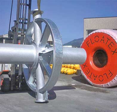 The general construction scheme consists of a central galvanized steel structure suitable to mount two separated floats made by laminated resistant expanded PE around the inner core and a final elastomer PU cover.